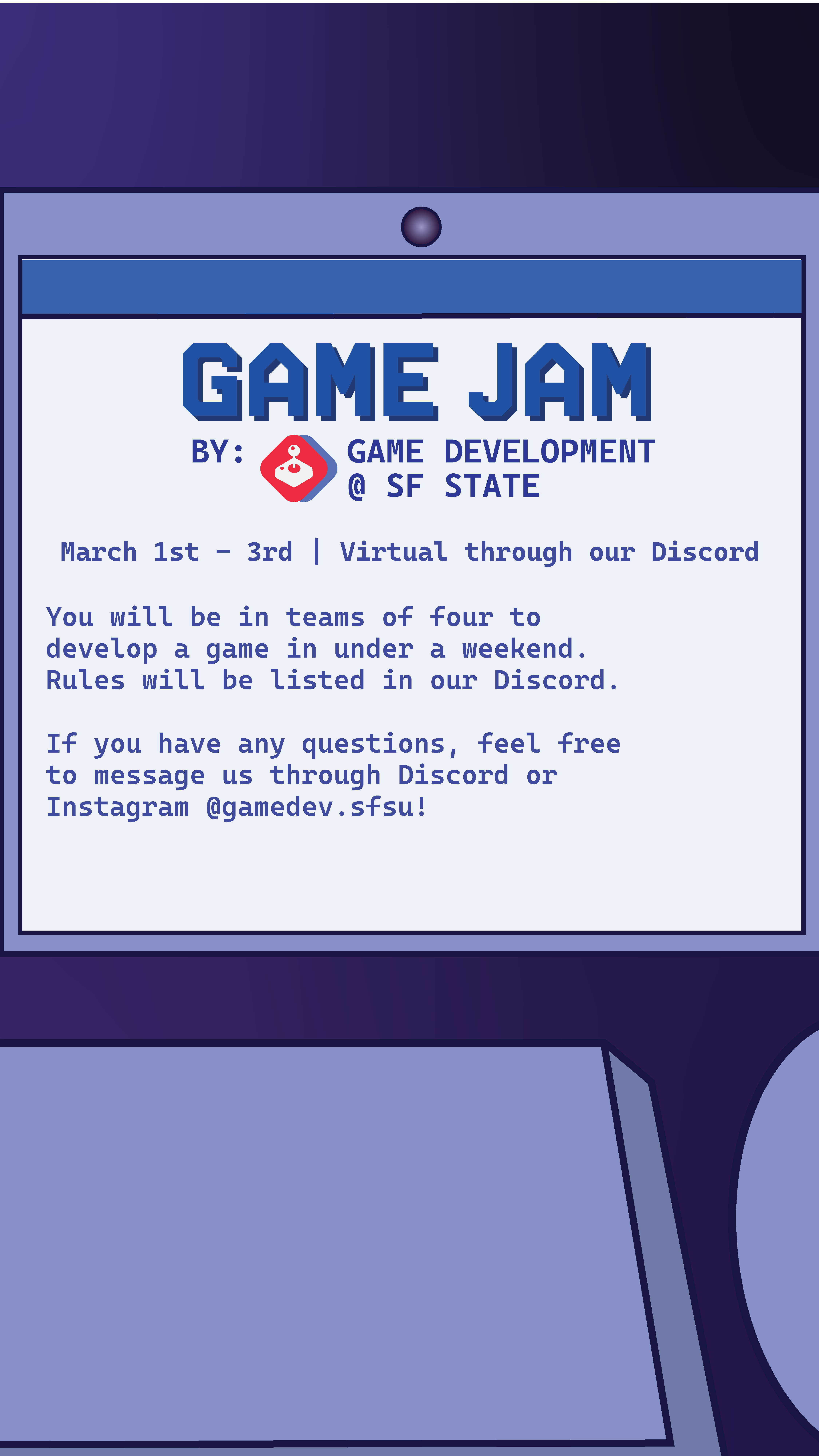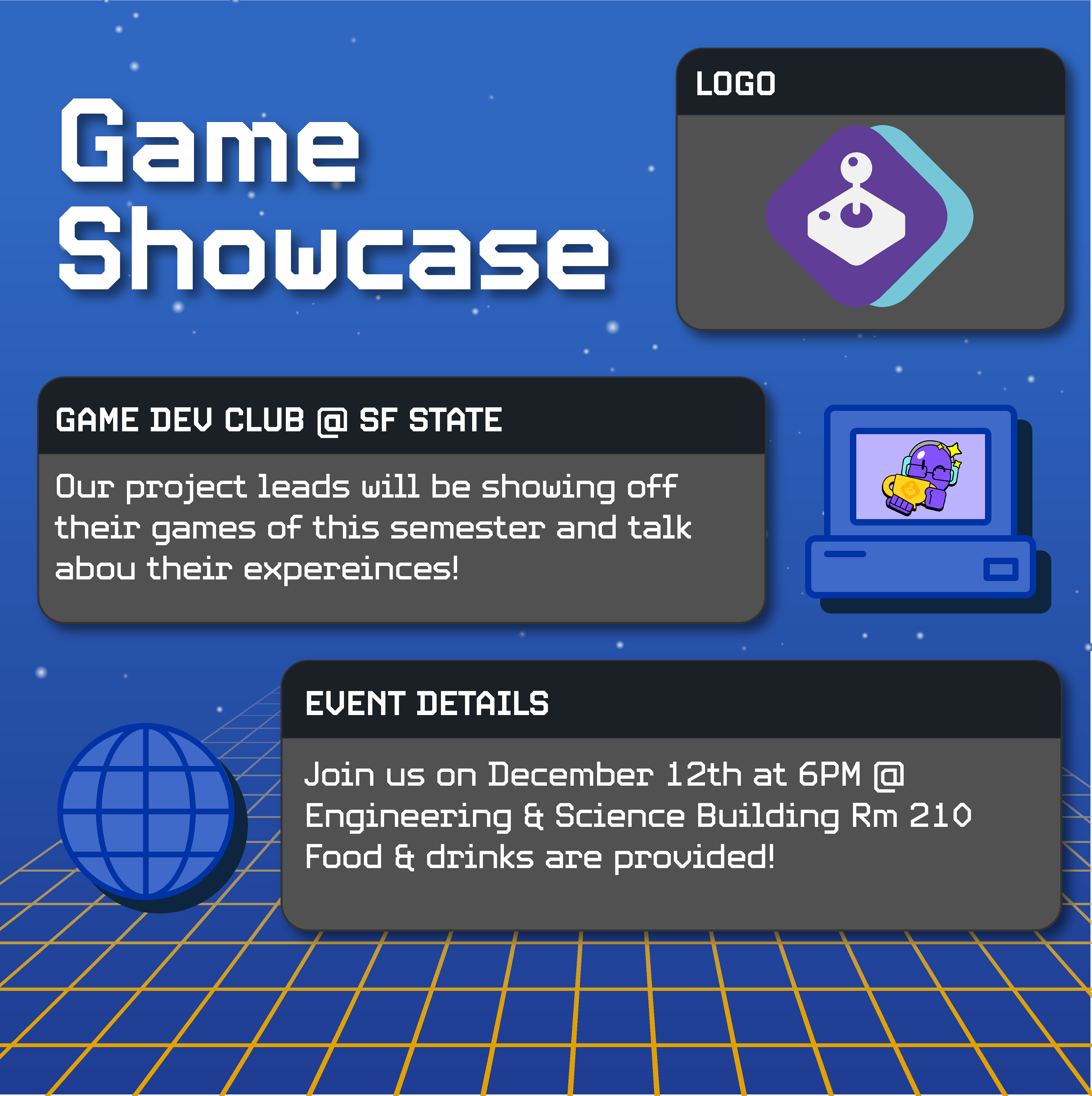 Project Description: As the social media/design lead for the Game Development Club @ SF State, I designed posters about club meetings and special events targeting SF State Students.